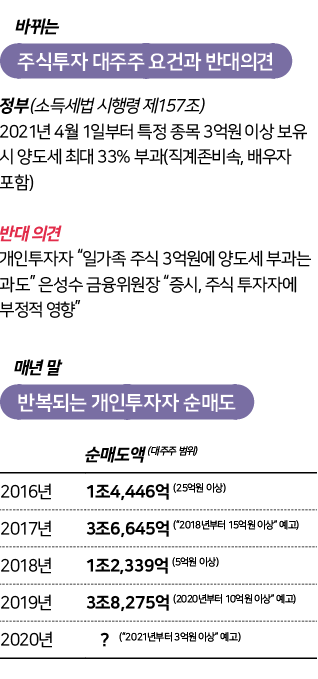 일반 소액 투자자의 거부감도 크다. 큰 손 개미들이 세금을 줄이고자 연말에 물량을 쏟아내면 주가에 악영향이 불가피하기 때문이다. 실제 대주주 요건이 각각 25억→15억원, 15억→10억원으로 낮아진 2017년과 지난해 12월, 개인투자자들은 전년동기 대비 3배 가까운 물량을 팔아치웠다.