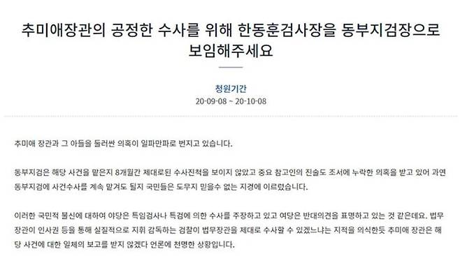 이런 상황에서 "추 장관과 전혀 이해관계가 없고 도리어 검언 유착 관련 법무장관의 수사 지시로 인해 대척 관계에 있었던 한동훈 검사장을 동부지검장으로 임명해 추 장관 관련 수사를 지휘하게 하여 주실 것을 청원한다"라는 글이 올라온 겁니다.
