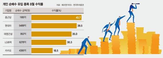 이외에도 태영건설(35.0%), LG화학(30.3%), 카카오(18.5%) 등 우량주들이 개인 매수세에 힘입어 주가 급등을 기록했다.