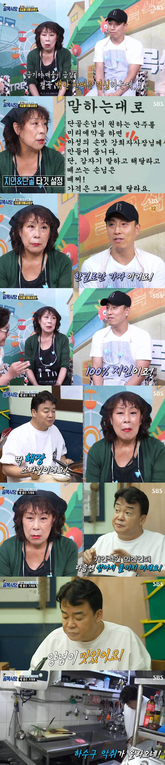 백종원은 백반과 고등어조림을 주문했다. 국을 한술 떠먹어본 백종원은 "딱 해장국 스타일"이라고 호평했다. 다른 반찬 역시 맛을 본 후 "맛있다. 이 정도에 5000원이면 가격도 괜찮다"고 만족스러워 했다. 고등어 조림 역시 "확실히 양념이 맛있다"라면서도 "조기와 고등어는 섞어서 졸이지 마라"고 조언했다.