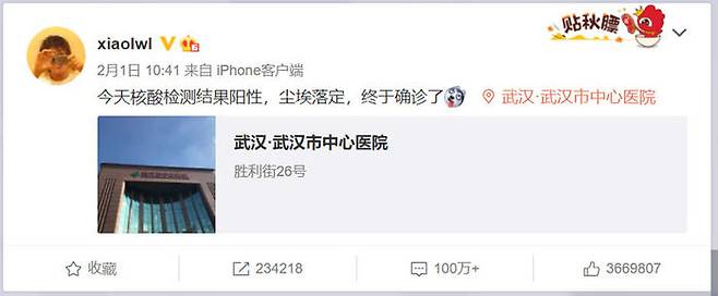 "오늘 핵산 검사 결과가 양성으로 나왔다. 먼지가 드디어 가라앉았다. 결국 확진 판정을 받았다." (今天核酸檢測結果陽性, 塵埃落定, 終于確診了)