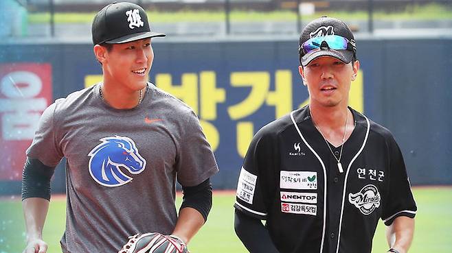 김건형과 심종원은 이날 처음 만난 사이지만, 금방 친해졌습니다. '슈퍼스타 아버지'를 뒀고, 미국에서 야구를 한 공통점이 둘을 묶었습니다. 심종원은 "내 성격이 워낙 긍정적이고, 주위 사람에게 말 거는 게 어렵지 않다"며 "동생이라 형에게 먼저 다가갔다. 이런저런 이야기를 하다 보니 금방 친해졌다"고 말했습니다. 김건형은 "오늘 처음 봤는데 종원이가 살갑게 다가왔다"며 "타지 생활하는 거 자체부터 공감대가 많이 있는 거 같아서 빠르게 친해졌다"고 웃었습니다.