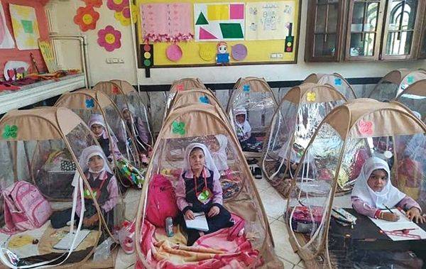 사진에는 교실 안에서 수업을 듣고 있는 어린 학생들의 모습이 담겼습니다. 그런데 일반적인 수업과는 많이 다릅니다. 책상과 의자는 온데간데없고, 학생들은 모두 투명한 '1인용 텐트' 안에 들어가 앉아 있습니다.