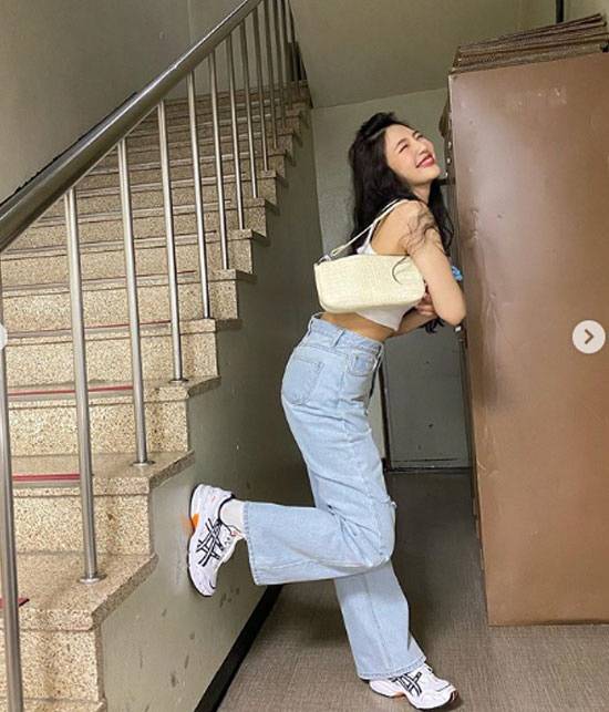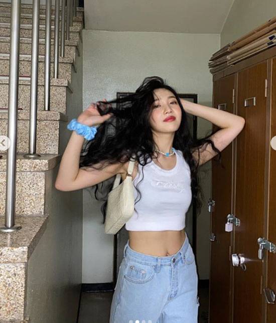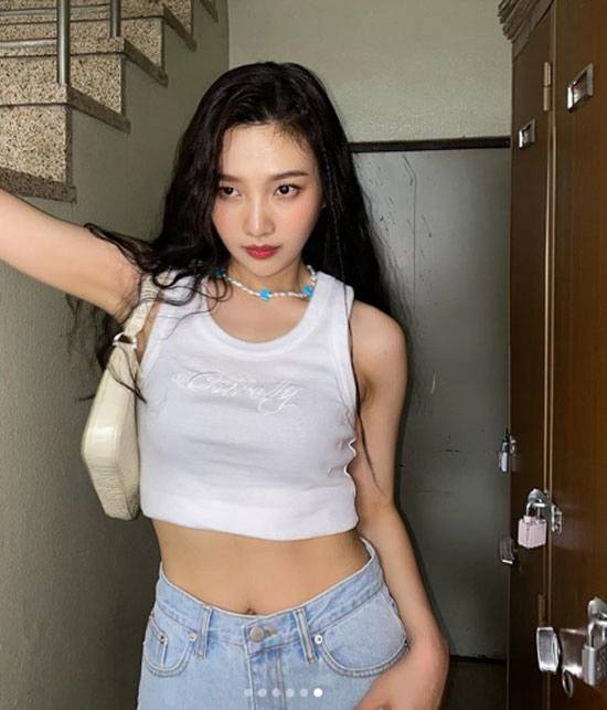 공개한 사진에는 흰색 민소매 크롭탑에 청바지를 입은 조이가 다양한 포즈로 촬영 중인 모습이 담겼다.
