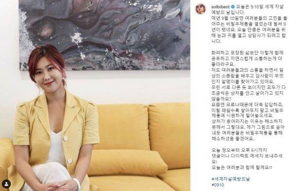 오늘(10일) 솔비는 자신의 인스타그램에 "오늘은 세계 자살예방의 날입니다. 매년 9월 10일 여러분들의 고민을 들어주는 '비밀우체통'을 열었는데 벌써 9년이 됐네요"라며 장문의 글을 올렸습니다.
