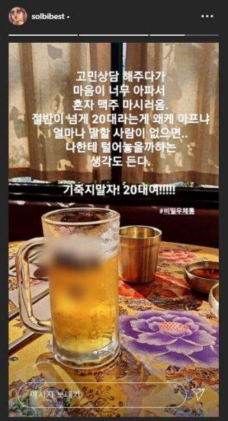 또 이날 솔비는 자신의 인스타그램 스토리에 "고민 상담 해주다가 마음이 너무 아파서 혼자 맥주 마시러 왔다"면서 "20대라는 게 왜 이렇게 아프냐. 얼마나 말할 사람이 없으면 나한테 털어놓을까하는 생각도 든다. 기죽지 말자! 20대여!"라며 20대 청년들에게 응원을 보냈습니다.