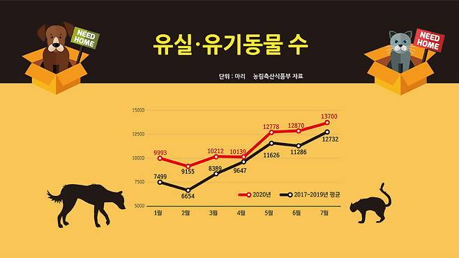 올해 유기동물 수는 최근 3년 평균 수치보다 49% 뛰었다. 농림축산식품부에 따르면 올해 7월까지 등록된 유기동물수는 7만8847마리로, 직전 3년 평균인 5만2835마리보다 2만6000마리 가량 늘었다. 특히 코로나19 확산 초기였던 2월과 3월에 평균치와 큰 차이를 보였다. 농식품부 조사는 각 지자체에서 신고한 유기동물 수를 종합하는 수치로, 미신고건을 포함하면 실제 수는 훨씬 많을 것으로 분석된다.
