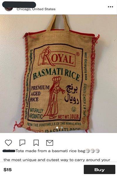 사실 이 가방은 인도 가정에서 바스마티 쌀을 담아두는 평범한 '쌀가마니'였기 때문입니다.