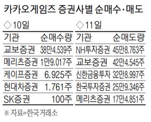 11일 한국거래소에 따르면 지난 10일 교보증권을 통해 카카오게임즈를 사들인 순매수량은 38만4539주에 이른다. 뒤를 이어 순매수량이 많았던 메리츠증권이 1만9017주에 그쳤다는 점을 감안하면 사실상 '독식'한 수준이다. 전체 순매수량(41만2342주) 가운데 93%를 차지하는 수치다.
