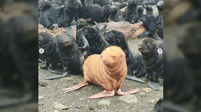 다른 물개들은 전부 검은색 털을 갖고 있는데 한눈에 봐도 확연히 다른 갈색 물개가 보이시죠?