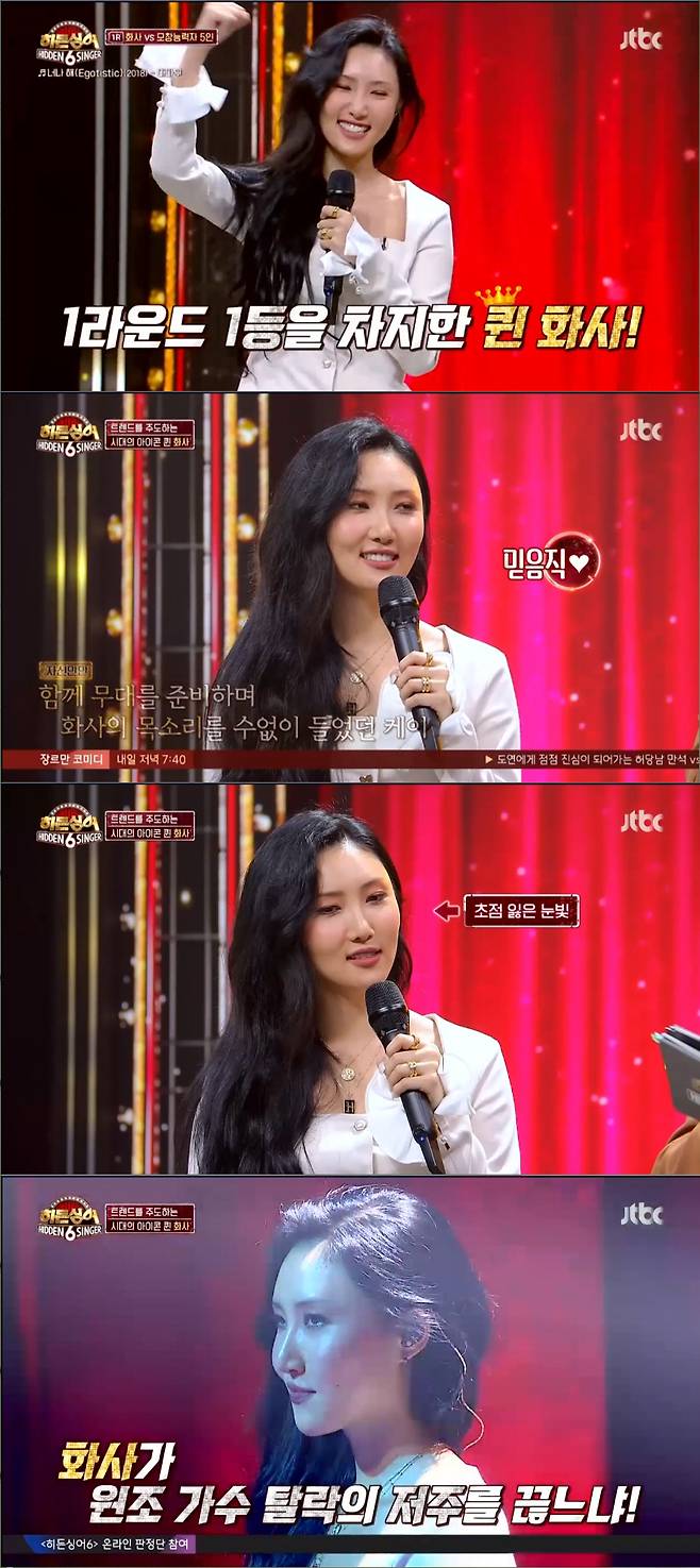 화사는 도도하게 걸어나와 남다른 바운스로 시청자들에게 인사했다. 화사는 "'히든싱어 시즌6'에 원조가수로 나왔다"며 긴장한 듯 자신을 소개했다.