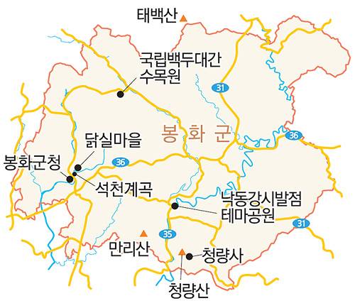 봉화를 말할 때 국도 35호선을 빼놓을 수 없다. 춘양면, 법전면, 명호면에 걸쳐 낙동강을 따라 만들어진 약 28km 길이의 도로다. 길을 가는 내내 깎아지른 협곡, 하늘과 맞닿아 있는 봉우리, 붓으로 정성들여 그린 듯한 능선이 한 폭의 커다란 그림을 보는 듯한 느낌이다. 강물이 흐르는 소리를 감상하는 건 덤이다. 운전대를 놓고 옆자리에 앉아 풍경만 보고 싶은 충동이 생길 정도다. 눈을 떼기 힘든 풍경들이 계속 펼쳐진다.