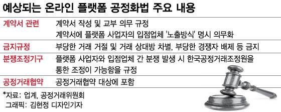 13일 정부에 따르면 공정거래위원회는 이달 중 입법예고 할 ‘온라인 플랫폼 공정화법’(이하 온라인플랫폼법)에 이런 내용의 ‘계약서 필수기재사항’을 담는 방안을 검토하고 있다.