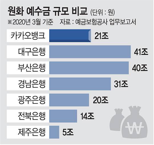 출범한 지 3년 만에 인터넷전문은행인 카카오뱅크의 수신규모가 약 21조 원으로 지방은행 평균 수준(약 25조 원)에 근접하는 것으로 나타났다.