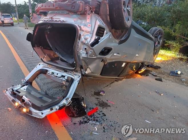 (김포=연합뉴스) 14일 오후 6시 45분께 경기도 김포시 대곶면 왕복 4차로 도로에서 SUV 차량과 승용차가 충돌했다. 이 사고로 SUV 차량을 운전하던 A(60)씨가 병원으로 옮겨졌지만 숨졌고 승용차 운전자가 치료를 받고 있다. 사진은 사고 현장 모습. 2020.9.15 [김포소방서 제공. 재판매 및 DB 금지]