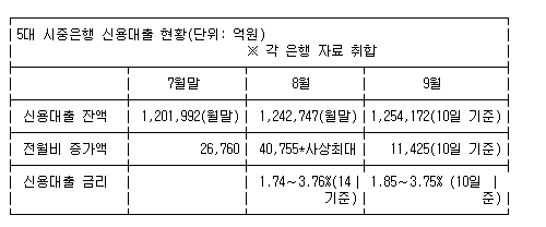 ![[그래픽] 5대 시중은행 신용대출 추이 (서울=연합뉴스) 김토일 기자 = 13일 KB국민·신한·하나·우리·NH농협 등 시중 5대 은행에 따르면 이달 10일 현재 신용대출 잔액은 총 125조4천172억원이다. kmtoil@yna.co.kr 페이스북 tuney.kr/LeYN1 트위터 @yonhap_graphics](https://img2.daumcdn.net/thumb/R658x0.q70/?fname=https://t1.daumcdn.net/news/202009/16/yonhap/20200916060506294mexz.jpg)