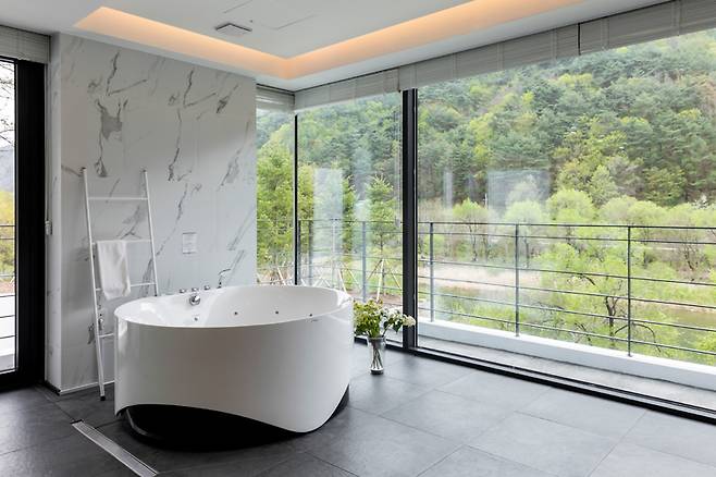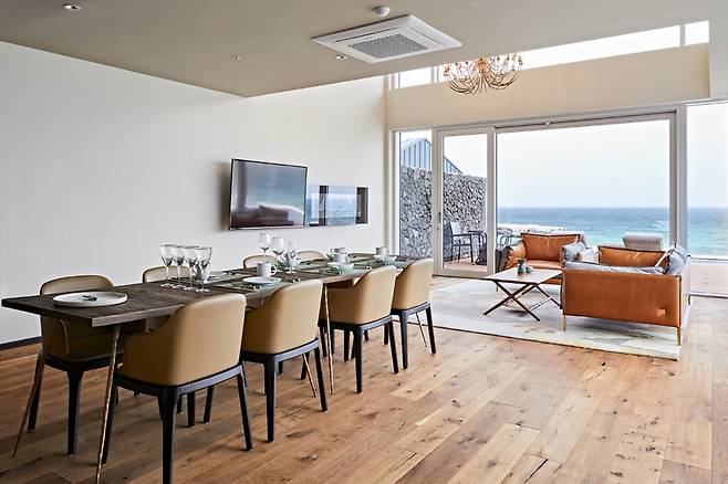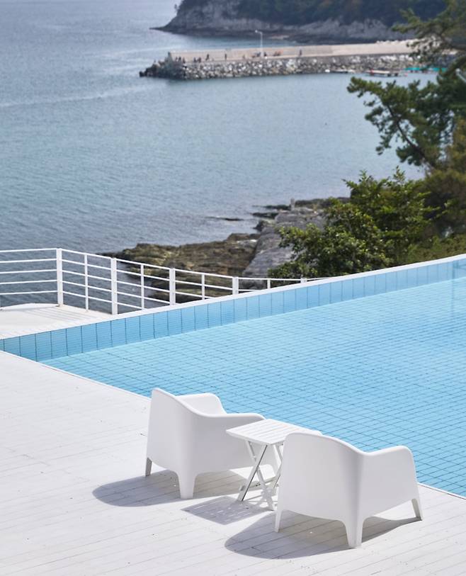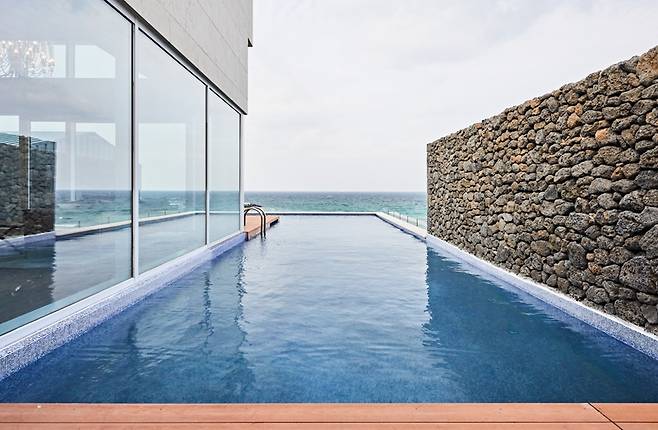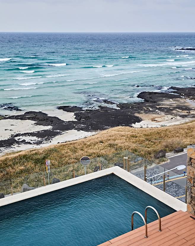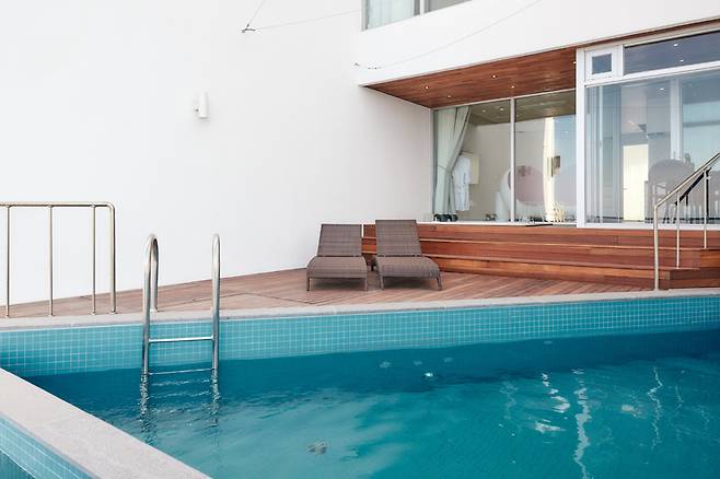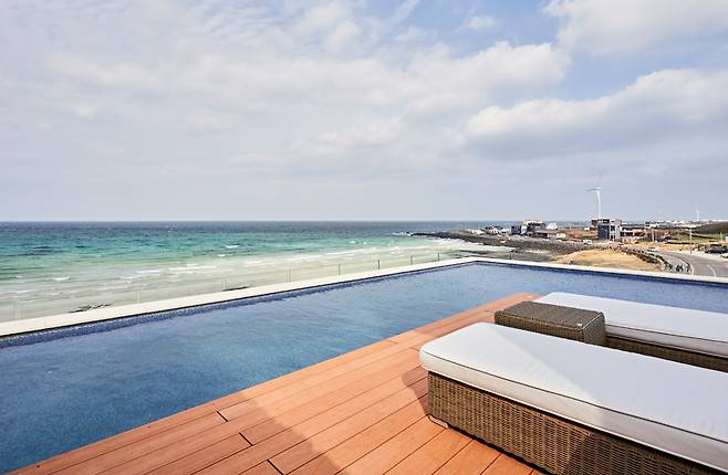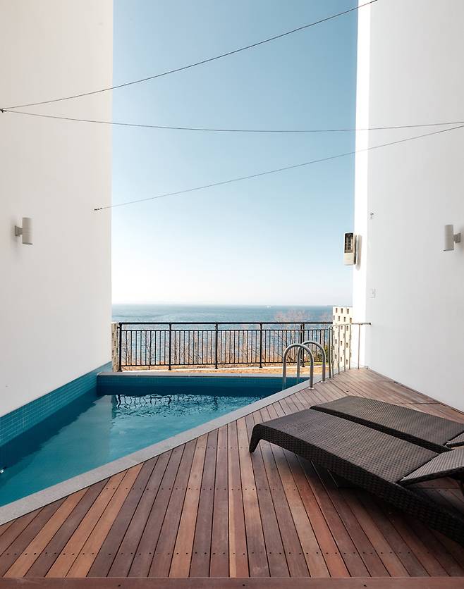 하이라이트는 주방 옆 바다를 향해 돌출된 공간에 놓인 아일랜드 욕조다. 순백색의 욕조 뒤로 두 면의 창에 바다와 인피니티 풀이 함께 담긴다. 따뜻한 물을 가득 받아 노곤한 밤, 맥주 한 잔을 홀짝이기도 좋다. 침실과 이어진 야외 테라스에는 인피니티 풀과 테이블이 놓여 있다. 가로 9m, 세로 4m 크기의 인피니티 풀은 동절기를 제외하고 31~32도를 유지해 따뜻하게 수영을 즐길 수 있다.