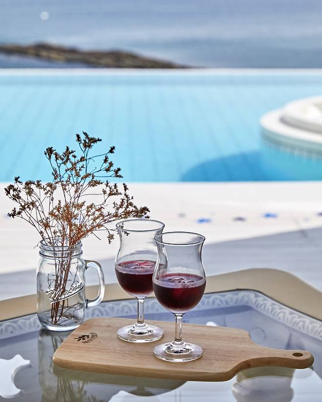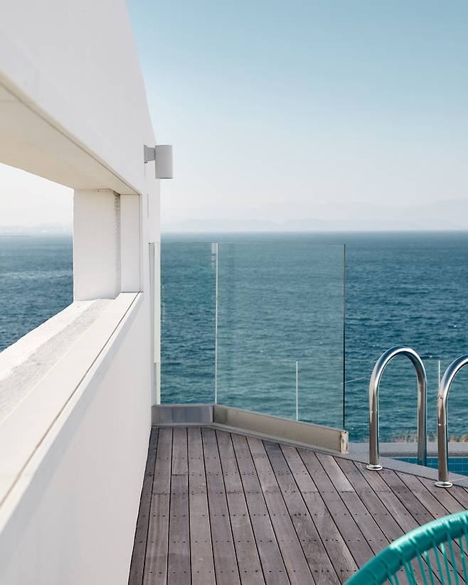 벽돌로 쌓아 올린 담장, 벤치와 가로등, 클래식한 자전거 등 입구부터 객실 통로까지 마치 그리스를 배경으로 한 영화 세트장에 와 있는 듯하다. 객실은 거실과 침실, 주방이 구분 없이 이어진 긴 직사각형 형태로 구성되어 있다. 크게 뚫린 전면 유리창을 통해 파노라마 오션뷰가 펼쳐진다. 주방 가전과 식기류도 모두 준비되어 있으며 정사각형의 아일랜드 식탁도 자리한다.