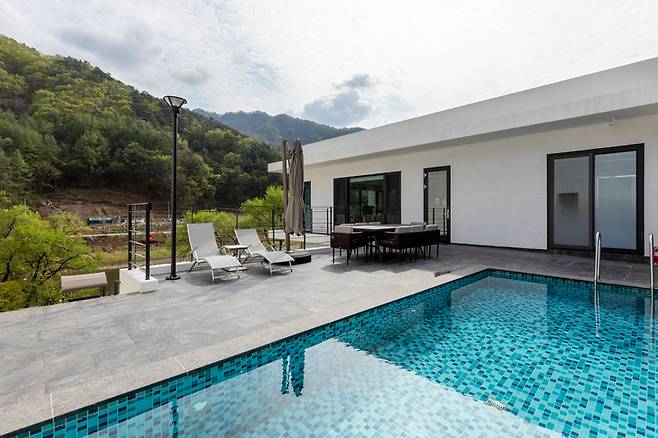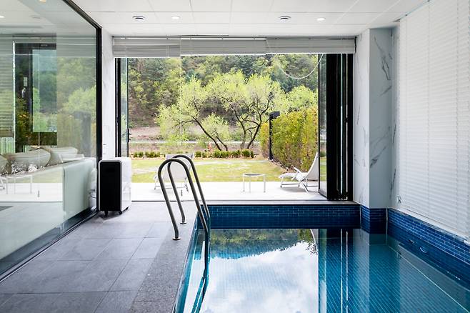 이곳은 개별 수영장과 정원이 있는 7개의 독채 펜션으로 구성되어 있다. 프라이빗한 휴식은 가장 기본 중 기본으로 누릴 수 있는 서비스다. 7개의 객실은 서로 겹치지 않고 하천을 따라 일렬로 자리한다. 30평부터 최대 66평까지, 최대 10명이 함께 머물 수 있으니 친구와도 가족과도, 연인과도 어울리는 선택지다.