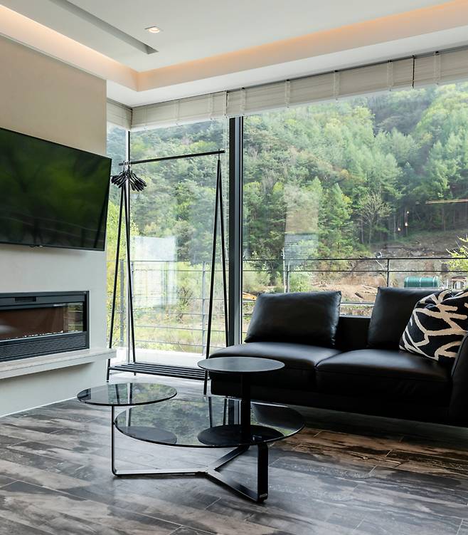 단체 여행을 계획한다면 G3, G6 객실이 제격이다. 비브릿지에서 가장 넓은 객실로 거실과 주방, 2개의 침실이 있는 복층 구조로 최대 10명까지 수용한다. 거실과 주방, 침실이 자리한 2층은 전면이 유리창이라 시원한 리버뷰를 누릴 수 있다. 테라스로 나서면 가로 7m, 세로 2.5m의 야외 수영장이 있는데 사계절 내내 온수로 운영된다. G1 객실은 장작과 벽난로가 매력 포인트다. 객실 중 가장자리에 위치해 유일하게 입구가 정원으로 연결되어 있어 마치 산장에 놀러 온 듯한 기분을 누릴 수 있다.