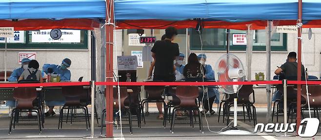 (서울=뉴스1) 임세영 기자 = 서울 강남구 K보건산업에서 7명이 신종 코로나바이러스 감염증(코로나19) 추가 확진 판정을 받은 가운데 16일 오후 서울 강남구보건소에서 시민들이 코로나19 진단 검사를 받기 위해 의료진의 설명을 듣고 있다. 서울시에 따르면 마스크 유통·수출업체인 K보건산업 직원 1명이 9일 최초 양성 판정을 받은 후 14일까지 13명, 15일 7명이 추가 감염됐다. 관련 확진자는 총 21명이다. 2020.9.16/뉴스1