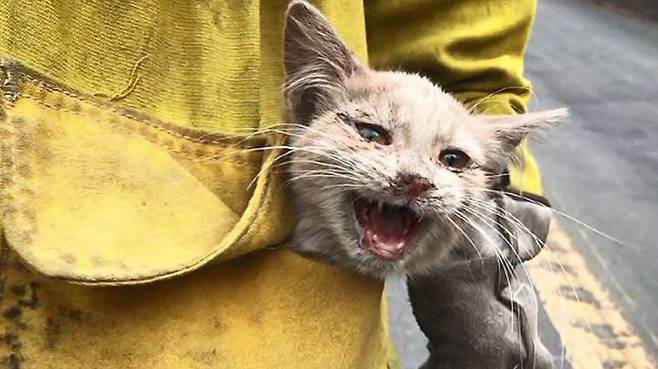 현장에 나간 소방관은 자신에게 달려오는 이 새끼 고양이를 발견해서 소방복 앞주머니에 넣어서 구조했습니다.