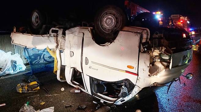 이 사고로 트럭이 전복돼 운전자 60살 최 모 씨 등 2명이 근처 병원으로 옮겨졌지만 끝내 숨졌고, 동승자 4명은 치료를 받고 있습니다.