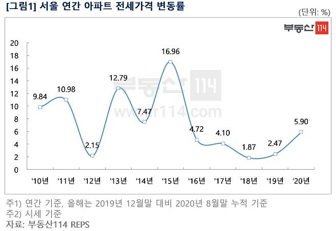 17일 부동산114에 따르면 올해 1~8월 서울 아파트 전셋값 누적 상승률은 5.90%로 집계됐다.