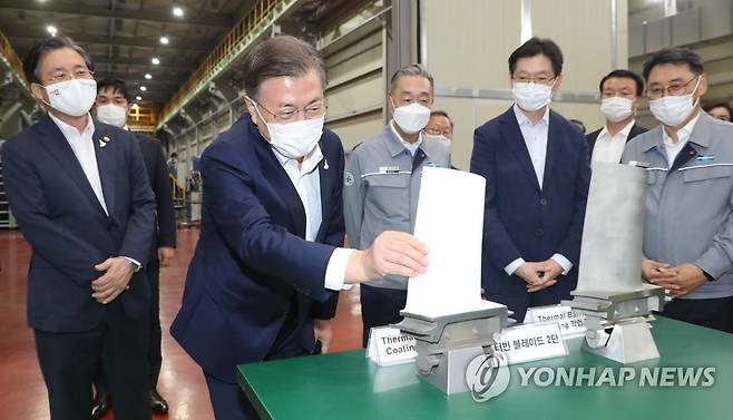 (창원=연합뉴스) 이진욱 기자 = 문재인 대통령이 17일 오후 경남 창원시 창원 스마트그린 산업단지 내 그린뉴딜 추진기업인 두산중공업을 방문해 가스터빈고온부품공장을 현장 시찰하며 세라믹코딩 블레이드를 살펴보고 있다.
