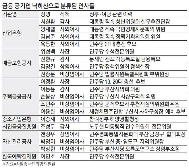 주택금융공사와 자산관리공사에는 민주당 부산시당 출신이 다수 포진해 있다. 이정환 주택금융공사 사장은 지난 대선 때 민주당 부산시 공동선거대책위원장을 지냈고, 19·20대 총선 당시에는 부산 남구 후보로 출마했다. 같은 기관 이동윤 감사와 손봉상 비상임이사는 각각 민주당 부산 시의원과 구의원으로 활동했다. 조민주(민주당 공직후보자 추천재심의위원)·이용한(새정치민주연합 부산시 사하구청장 예비 후보) 비상임이사도 민주당 부산시당과 연이 깊다.