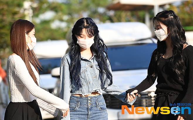 걸그룹 장규리, 백지헌, 이채영이 9월 19일 오전 ‘MBC 쇼! 음악중심’ 일정 차 서울 마포구 MBC 상암사옥으로 들어서며 포즈를 취하고 있다.
