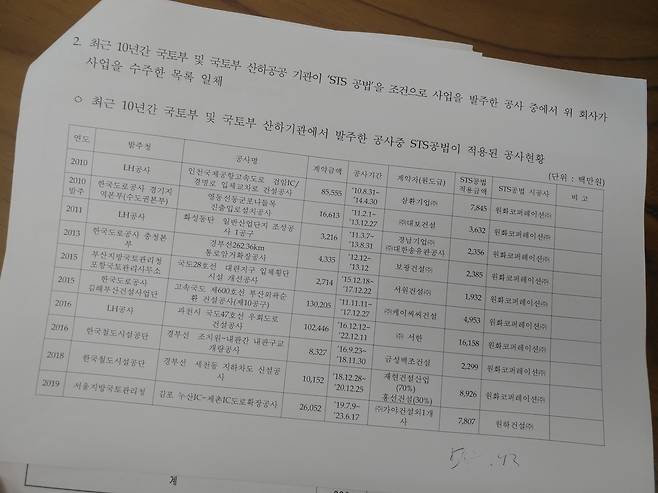 이중에는 한국도로공사가 발주한 168억 원이 넘는 서평택IC 리모델링 공사와 한국토지주택공사에서 발주한 319억 원짜리 김포한강 주변도로 건설공사도 포함됐다. 이 공사들은 모두 박 의원 일가 건설사에 단독으로 도급됐다.