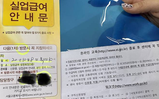 | ▲ 실업급여 안내문 최은경(가명)씨가 17일 실업급여 안내문을 받았다. |