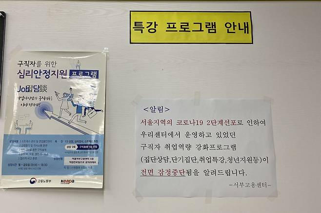 17일 기자가 찾은 중구·남부·서부 고용복지플러스센터는 전화 문의와 방문에 대응하느라 내내 분주했다. 다만, 구직자 취업역량 강화프로그램 등 오프라인 강의는 대부분 온라인으로 대체했다. 집단상담, 취업특강, 청년지원 상담도 마찬가지다. 대면으로 이루어지는 프로그램을 최소화하고 있다. 서부센터는 '서울지역의 코로나19 2단계 선포로 구직자 취업역량 강화프로그램을 전면 잠정중단한다'는 안내문을 붙였다.