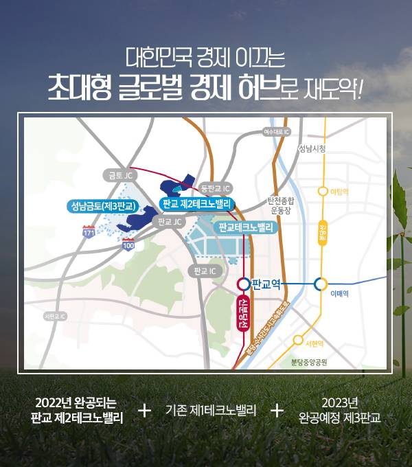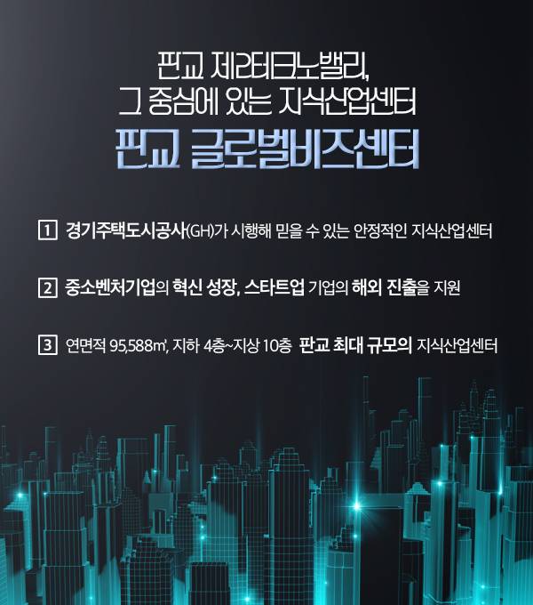 또한 ‘판교 글로벌비즈센터’는 판교 비즈니스벨트의 중심에 위치해 집적효과를 그대로 누릴 전망입니다. 첨단 ICT, SW기업과 글로벌 R&D기업의 융복합 클러스터 단지인 판교 테크노밸리와 인접해 있기 때문입니다. 여기에 향후 판교 제3판교 완공 시 총 167만여㎡에 2,500여개 기업 13만여 명이 근무하는 초대형 경제생태계가 구축될 것으로 보입니다.