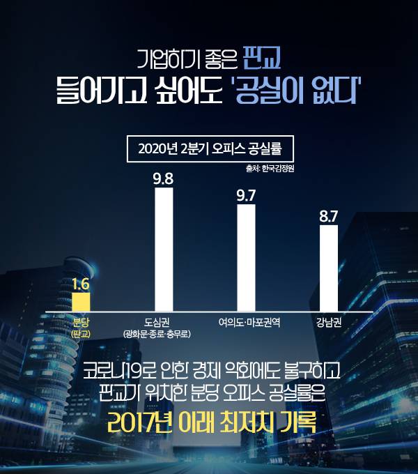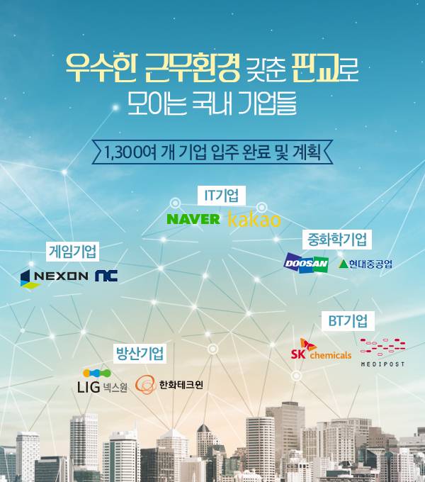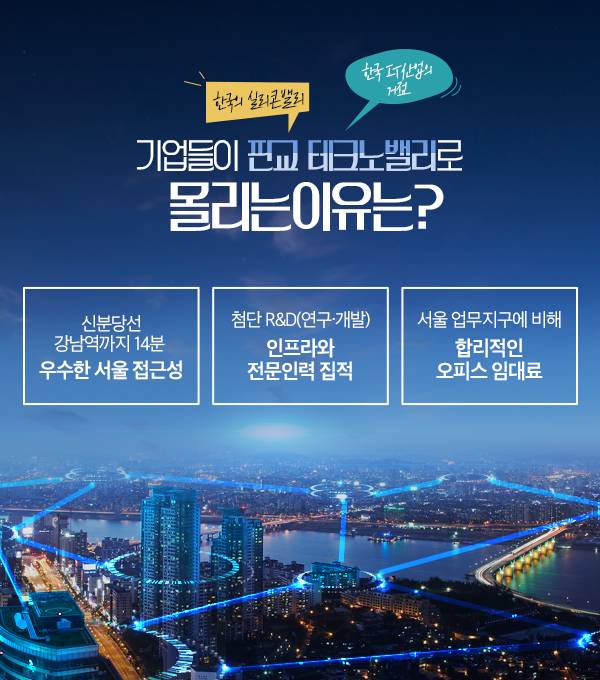 또한 첨단 R&D(연구∙개발) 인프라와 전문인력이 집적돼 있어 우수한 업무환경을 갖춘 것은 물론, 서울 주요 업무지구에 비해 오피스의 임대료는 합리적이라는 점도 기업 수요를 판교로 끌어들이는 요소로 꼽힙니다.