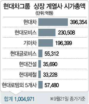 21일 한국거래소 등에 따르면 이날 종가 기준 현대차그룹 12개 상장 계열사 전체의 시가총액이 100조4,971억원으로 집계됐다.