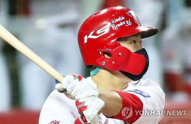 (광주=연합뉴스) 조남수 기자 = 22일 광주-기아챔피언스필드에서 열린 2020 KBO리그 키움 히어로즈와 KIA 타이거즈의 경기에서 KIA 1번 타자 최원준이 가족의 교통사고로 미국으로 출국한 브룩스의 이름을 헬멧에 새기고 4회 말에 타격하고 있다. 2020.9.22