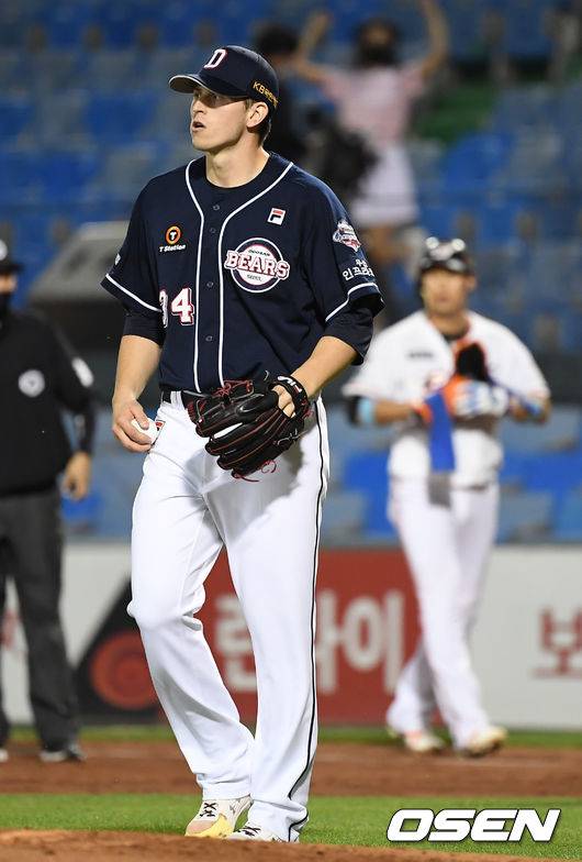 4회말 1사 두산 플레센이 한화 하주석에게 기습번트를 허용한 뒤 숨을 고르고 있다. /youngrae@osen.co.kr