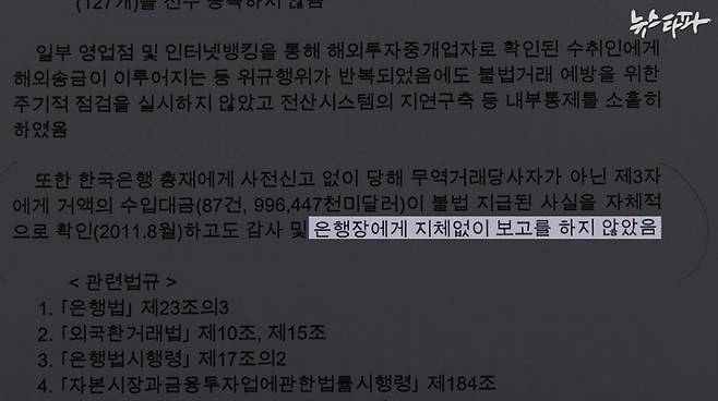 미국 자금세탁방지법 위반 혐의 기소를 유예받은 대신 미국 연방검찰에 5천백만 달러, 뉴욕주 금융감독청에 3천5백만 달러 등, 우리 돈으로 1천49억 원이 넘는 벌금을 낸다는 게 이 합의문의 골자 입니다.