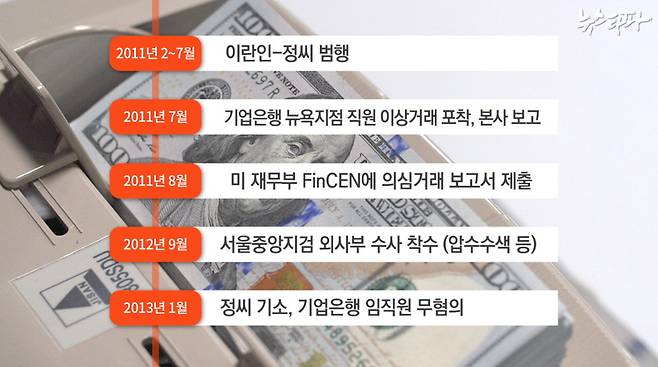 한국 검찰은 그로부터 1년 넘게 지난 2012년 9월 수사에 착수해 정 씨를 외국환거래법 및 관세법 위반으로 구속 기소했습니다. 검찰은 기업은행 관계자들도 조사했지만 정 씨가 조작한 가짜 무역 서류에 속아서 거래를 허용해준 것이라는 결론을 내렸습니다.