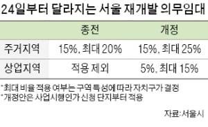 그동안 임대주택 의무공급 대상에서 제외됐던 상업지역 재개발에는 5% 의무비율이 신설됐다. 5%는 법에서 규정한 범위(5~20%)의 최하한선이다. 서울시는 조례개정안을 24일 고시할 예정이다.