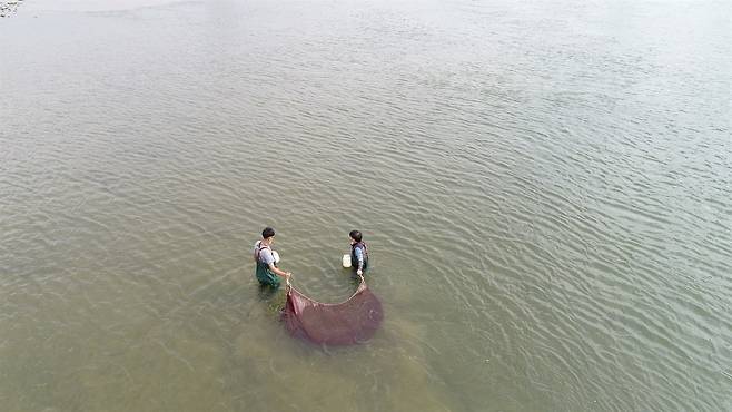 | ▲ 두 사람이 족대로 강바닥을 훑으면서 잡은 물고기. |