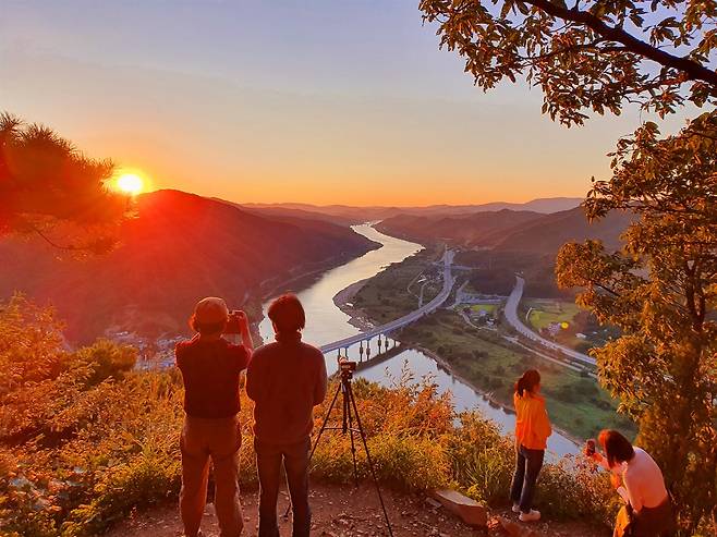 S자 형태로 굽이굽이 흘러가는 금강에서 불어오는 강바람이 시원했다. 붉게 물들어가던 태양이 산자락 사이로 숨어들 때는 온 산에 불을 놓은 듯 붉게 타올랐다. 금강에 불이 났다고 흥얼거리는 사람도 있었다. 카메라 셔터를 누르고 핸드폰에 고개를 대고 사진을 찍느라 넋을 놓고 있다.
