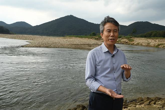 | ▲ 물고기 조사가 끝나고 순천향대학교 방인철 교수와 강변에서 현장 인터뷰를 했다. |