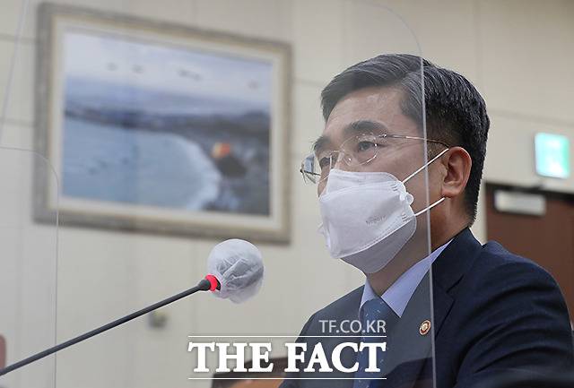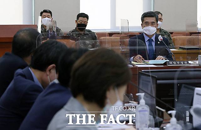 [더팩트ㅣ국회=이새롬 기자] 서욱 국방부 장관이 24일 오후 서울 여의도 국회에서 연평도 인근 실종 공무원 북한 피격 사건 관련 긴급현안보고를 위해 열린 국방위원회 전체회의에 출석해 의원들 질의에 답하고 있다.
