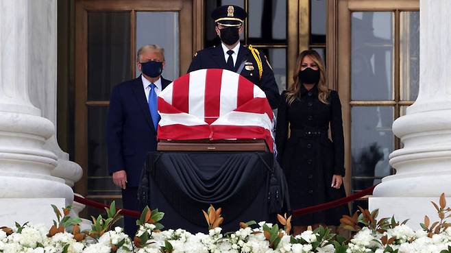 트럼프 대통령과 부인 멜라니아 여사는 어제 오전 10시 긴즈버그 대법관의 시신이 안치된 대법원을 방문해 입구에 놓인 관 앞에서 몇 분간 머물며 경의를 표했습니다.