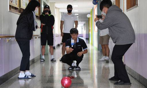 | “잘 찍고 있지?” 경기도 수원시 장안구 율전중학교 학생들이 지난 22일 복도에서 온라인 가을 운동회 종목을 직접 해보며 동영상을 촬영하고 있다. 수원=허정호 선임기자 |