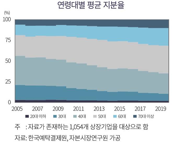 개인투자자의 비중이 높은 상황에서 개인투자자의 고령화가 매우 급속히 진행되고 있다는 점도 주목할 만한 추세적 변화다. 상장기업 개인주주 보유지분의 연령대별 비중을 보면, 50대 이상 개인주주의 비중은 2005년 44%에서 2019년 65%로 21%포인트 증가한 반면 40대 주주의 비중은 35%에서 24%로 11%포인트, 30대 주주의 비중은 18%에서 9%로 9%포인트 감소했다.