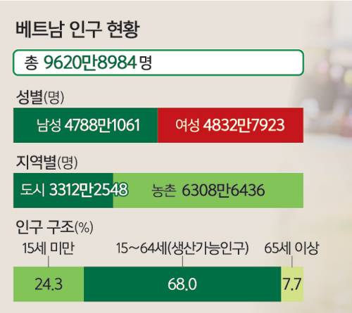 아시아도 저출산 경향에서 예외가 아닌 가운데 지난 20년 동안 해마다 꾸준히 130만명 이상의 신생아가 태어나며 ‘황금 인구구조’(Golden Population Structure)를 유지하는 나라가 있다. 바로 베트남이다. 2019년 베트남 인구주택총조사 결과에 따르면 베트남 인구는 약 9620만명으로, 전체 인구 가운데 15∼64세 생산가능인구 비율이 68%에 달했다.